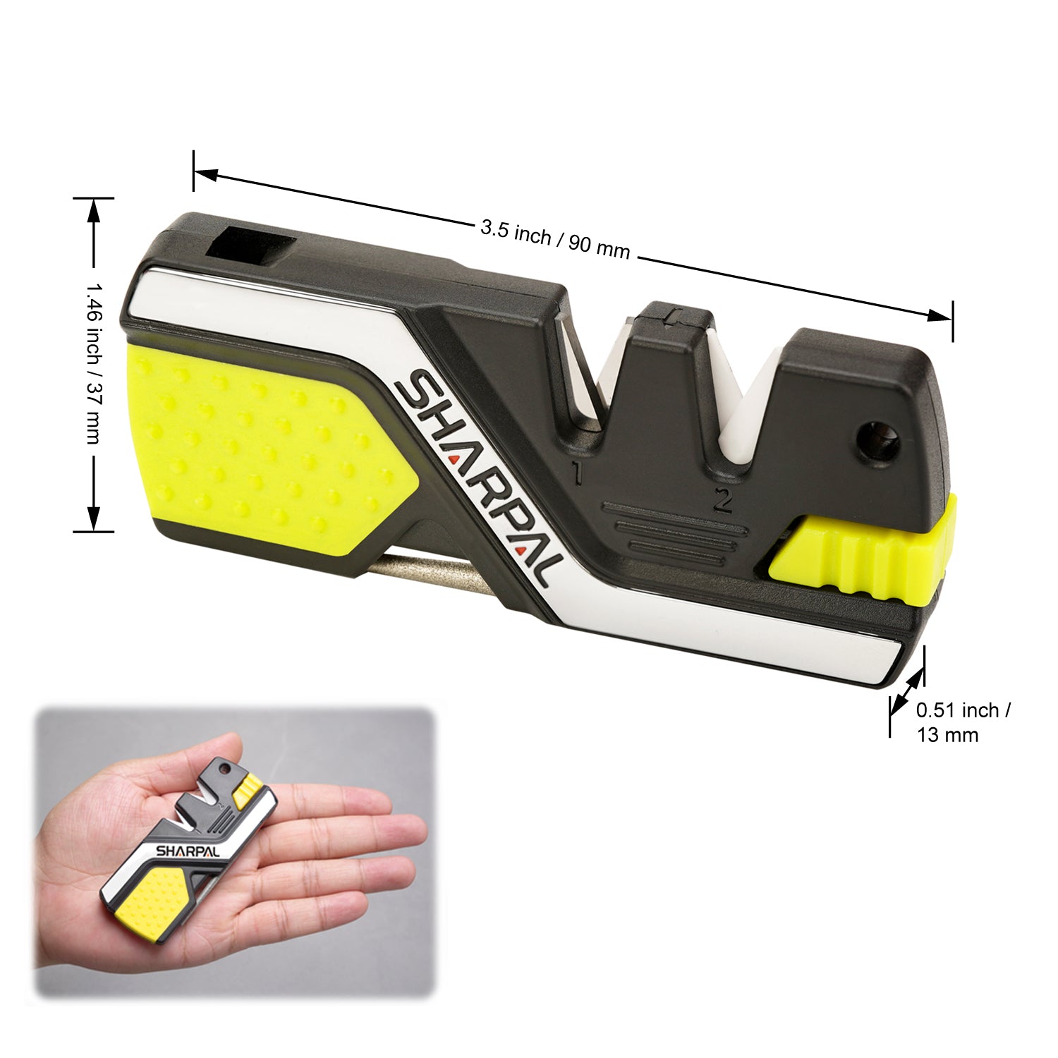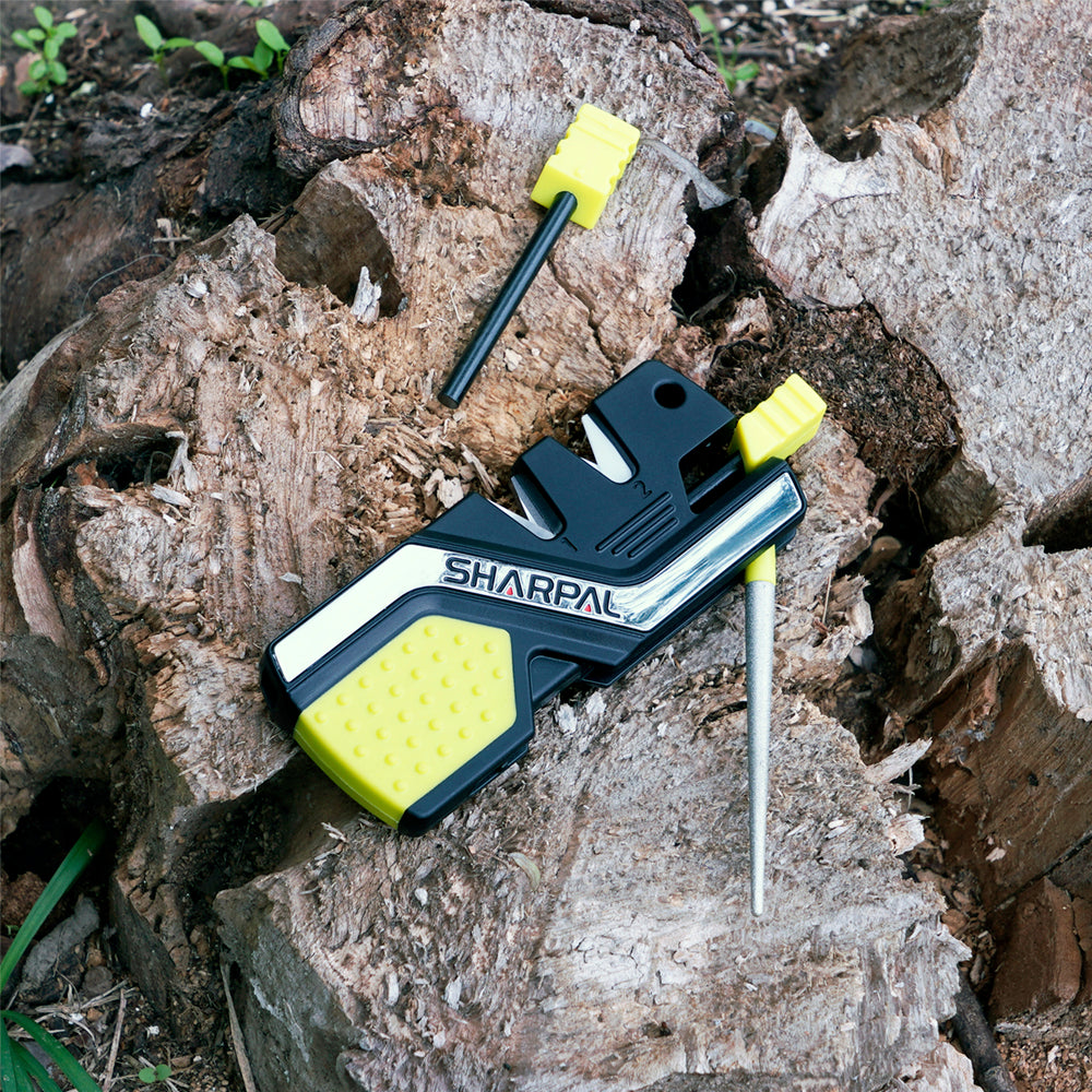 SHARPAL 101N-G 6-In-1 Knife Sharpener & Survival Tool Green Version features pre-set crossed carbides for quick edge setting and ceramic blades for fine honing. A fold out, tapered Medium 400 Grit diamond coated rod with grooves is designed to sharpen serrations, gut hooks & fishhooks. And two built-in fire starters, high-pitched whistle are for outdoor emergency use. Useful for hunters, fishermen, campers, fire & rescue, cooks. Compact body with lanyard hole fits in your pocket, hunting pack, tool box.
