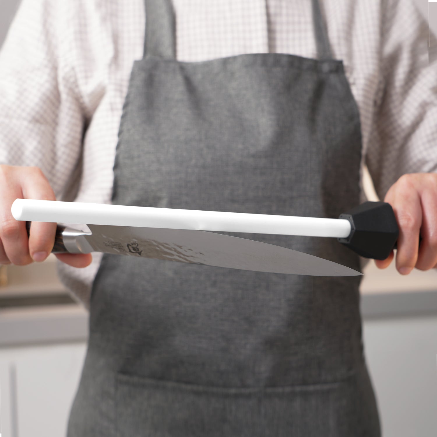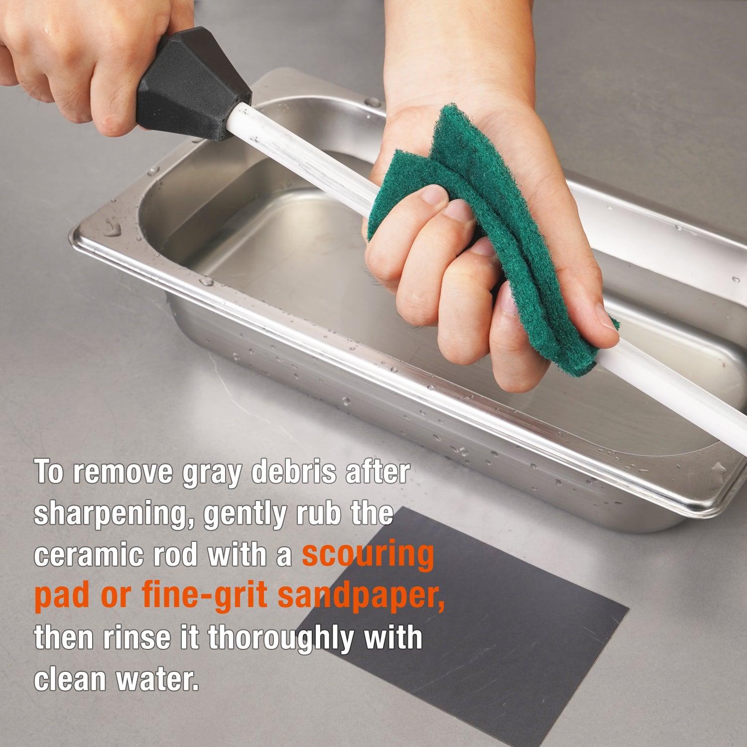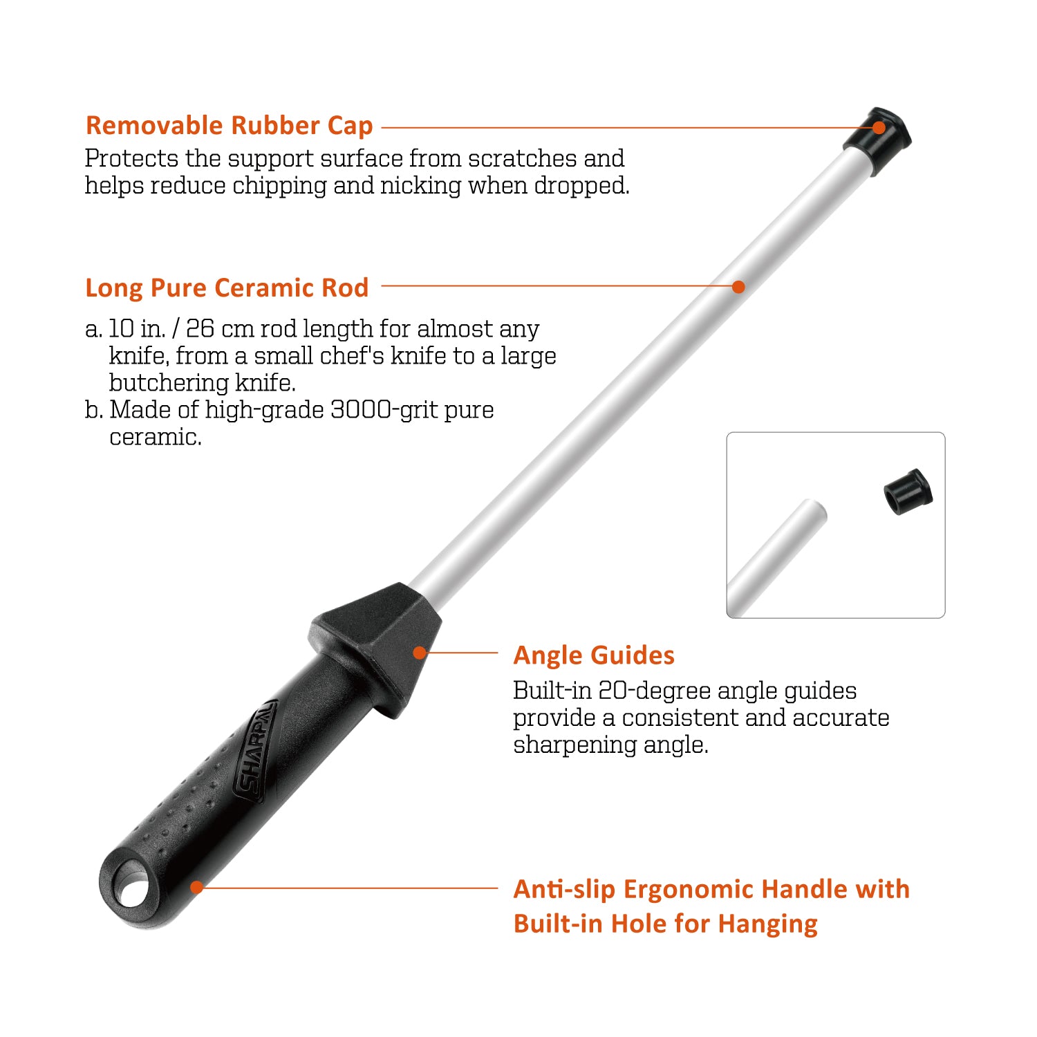 SHARPAL 118H 10 in. Ceramic Sharpening Rod features built-in 20-degree angle guides to ensure consistent and accurate sharpening every time, while the hexagonal hand guard keeps the rod from rolling and enhances user safety during operation. Made from high-performance ceramic, which is much harder than steel, it is ideal for honing and refining knives and tools crafted from extremely hard materials that standard steel sharpeners cannot handle. The 3000 grit fine ceramic surface offers excellent abrasion resistance and durability, allowing you to polish and refine your blade edges to a razor-sharp finish with ease. Designed for both protection and practicality, the rod includes a removable rubber cap that safeguards surfaces from scratches and helps reduce damage from accidental drops, while the ceramic itself is non-toxic, odorless, and resistant to rust for lasting, reliable performance.